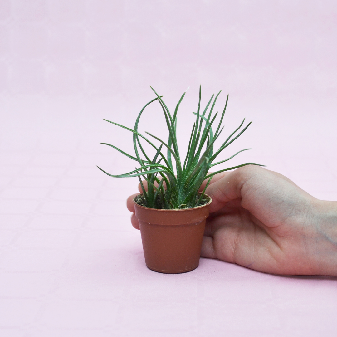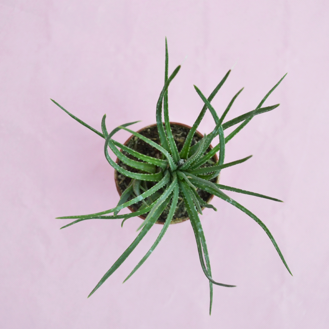 Belonging to the family of Asphodelaceae, this Aloe bowiea plant is supplied in a Ø 5,5 cm pot with a label indicating its botanical name.