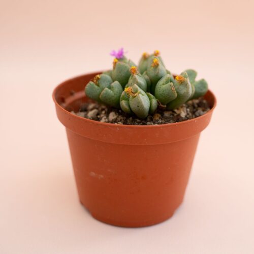 Belonging to the family of Aizoaceae, this Conophytum bilobum sub. gracilistylus plant is supplied in a Ø 10,5 cm pot with a label indicating its botanical name.