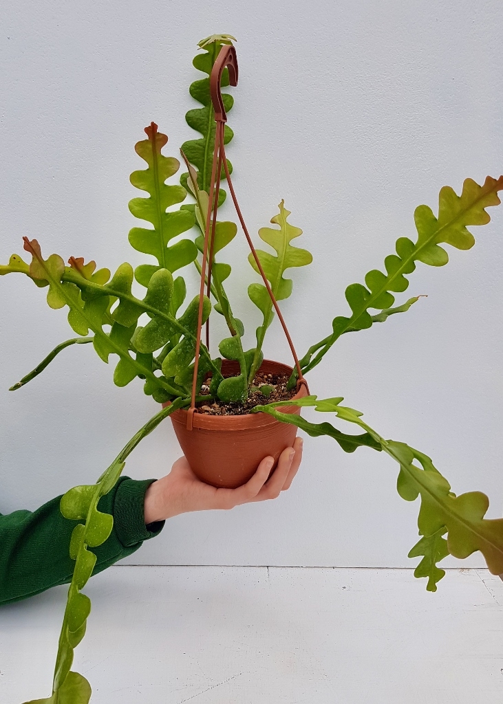 Belonging to the family of Cactaceae, this Epiphyllum anguliger plant is supplied in a Ø 14 cm pot with a label indicating its botanical name.