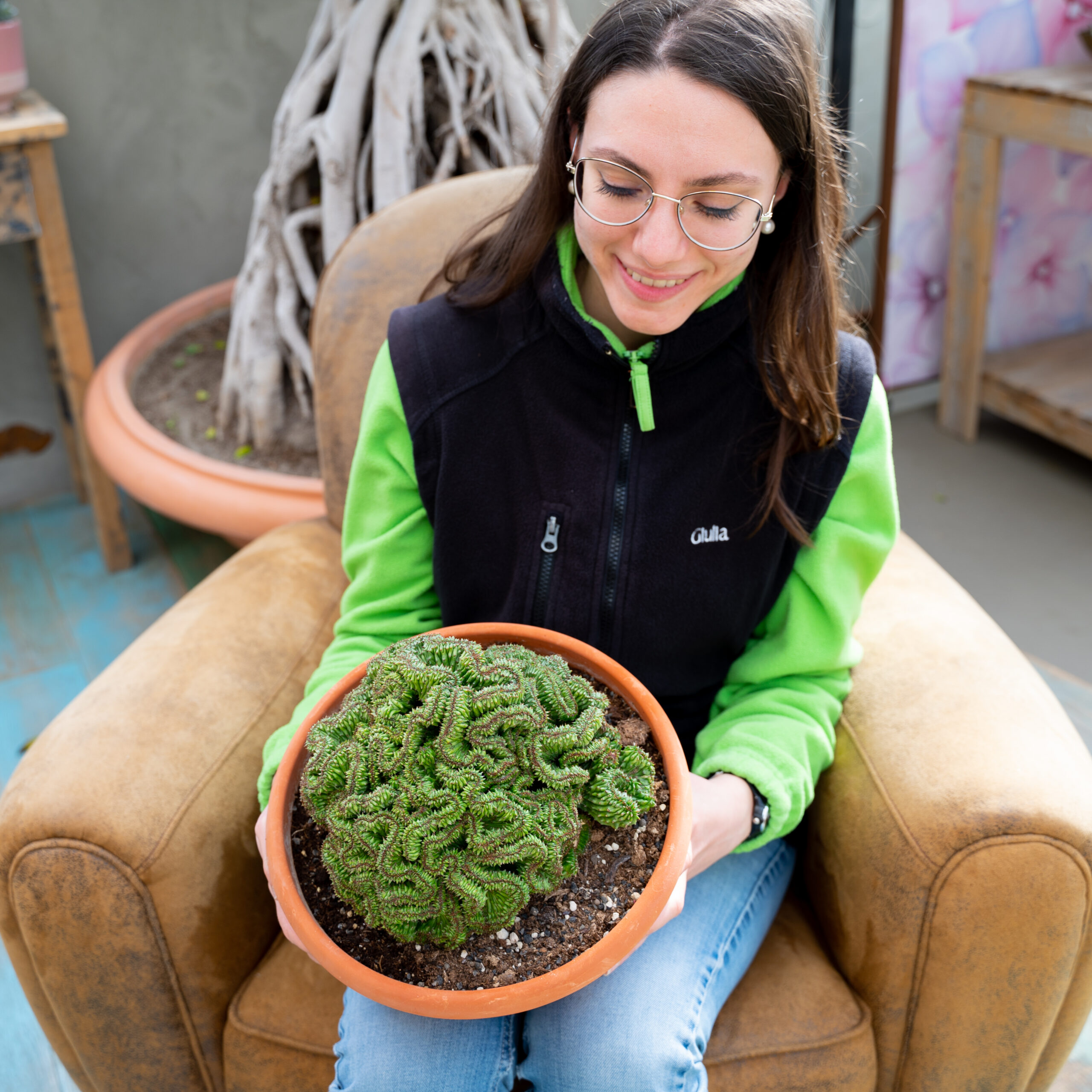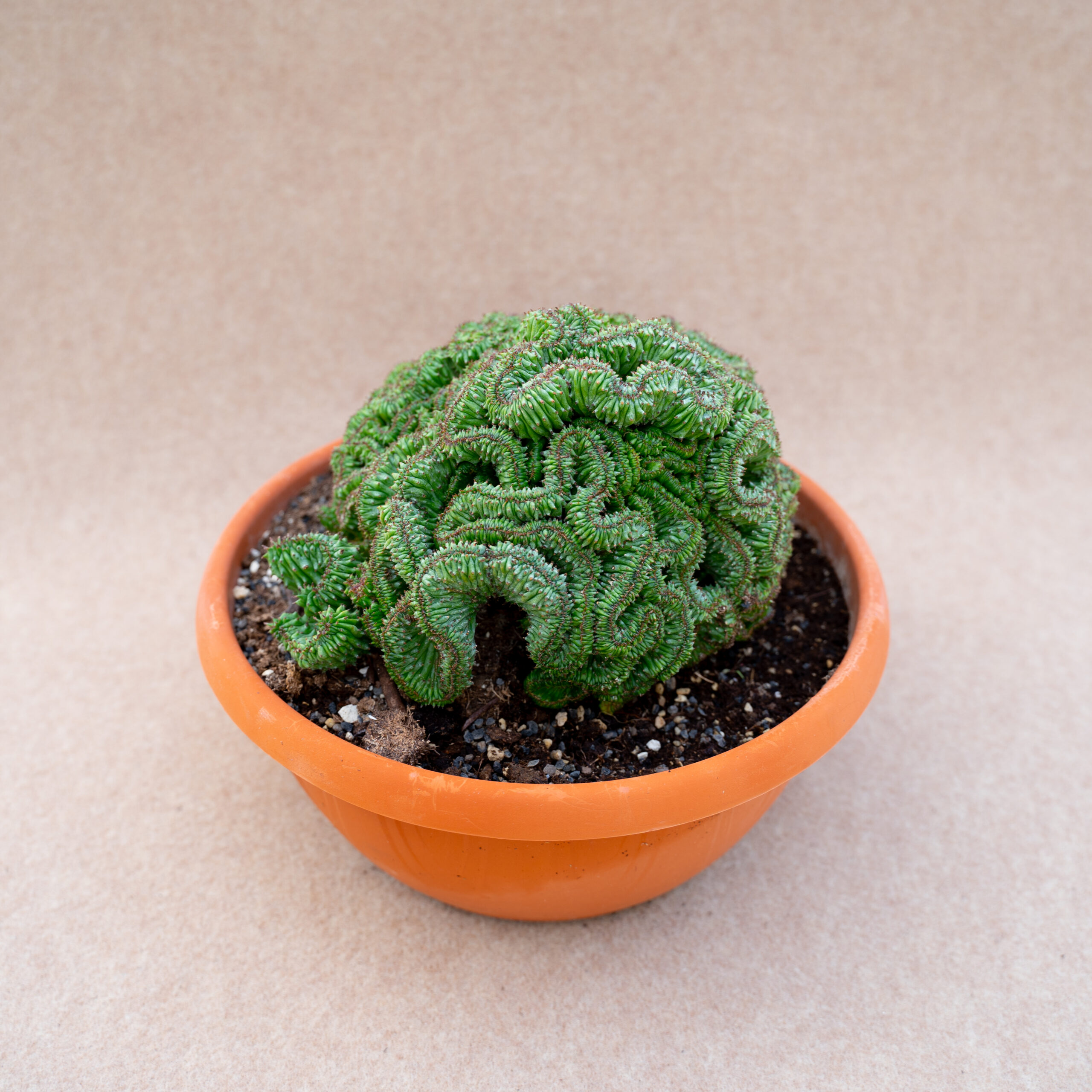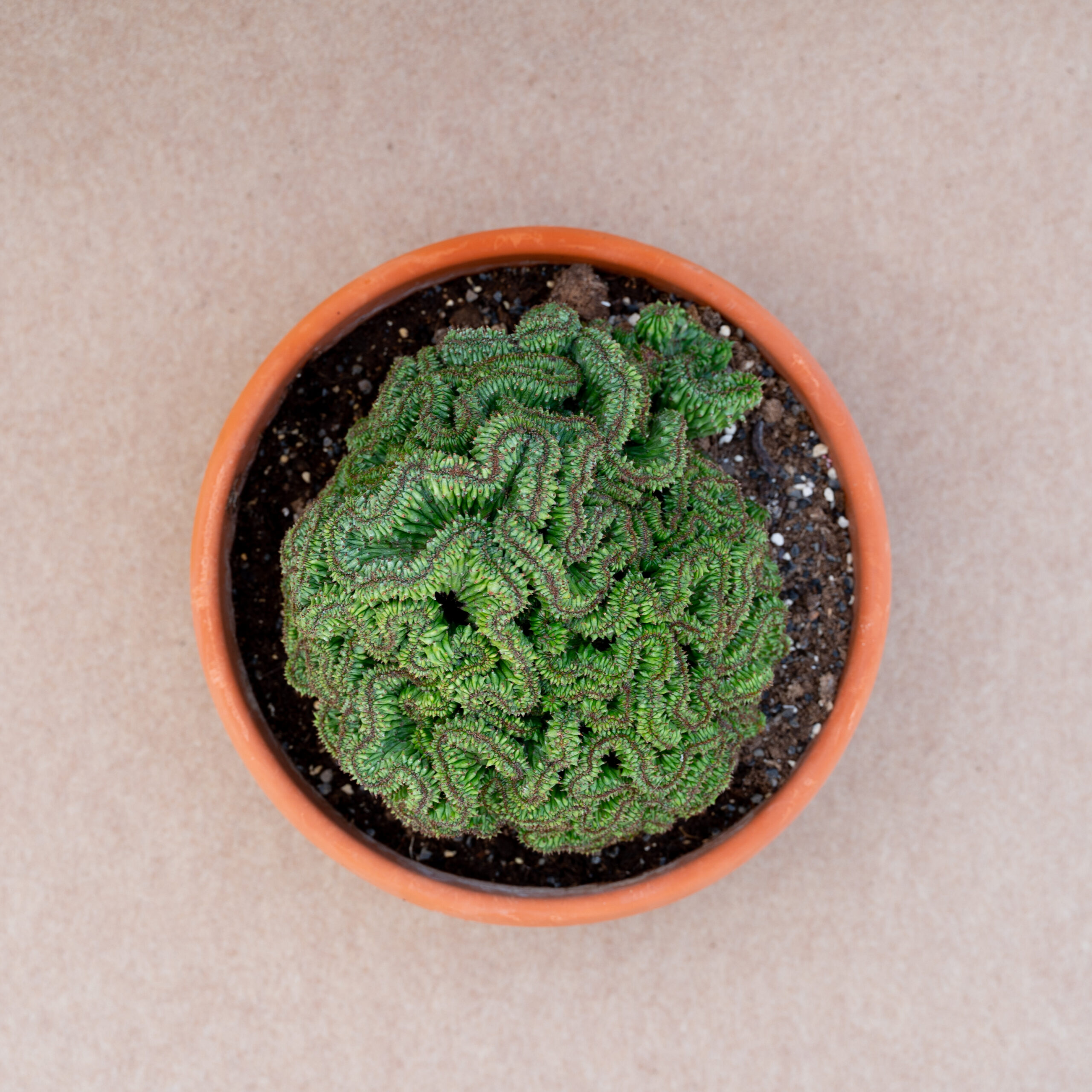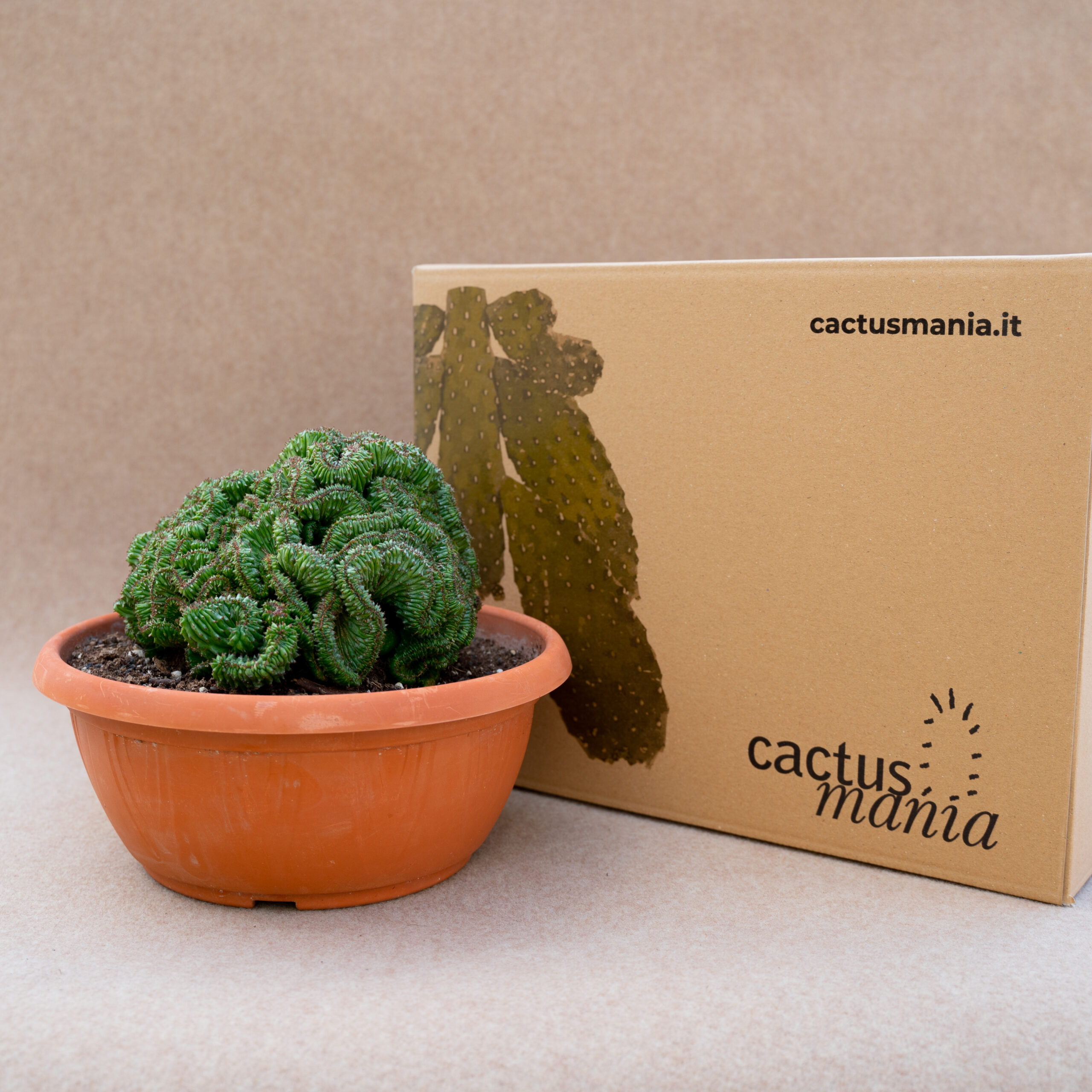 Belonging to the family of Euphorbiaceae, this Euphorbia polygona f. cristata plant is supplied in a Ø 25 cm pot with a label indicating its botanical name.