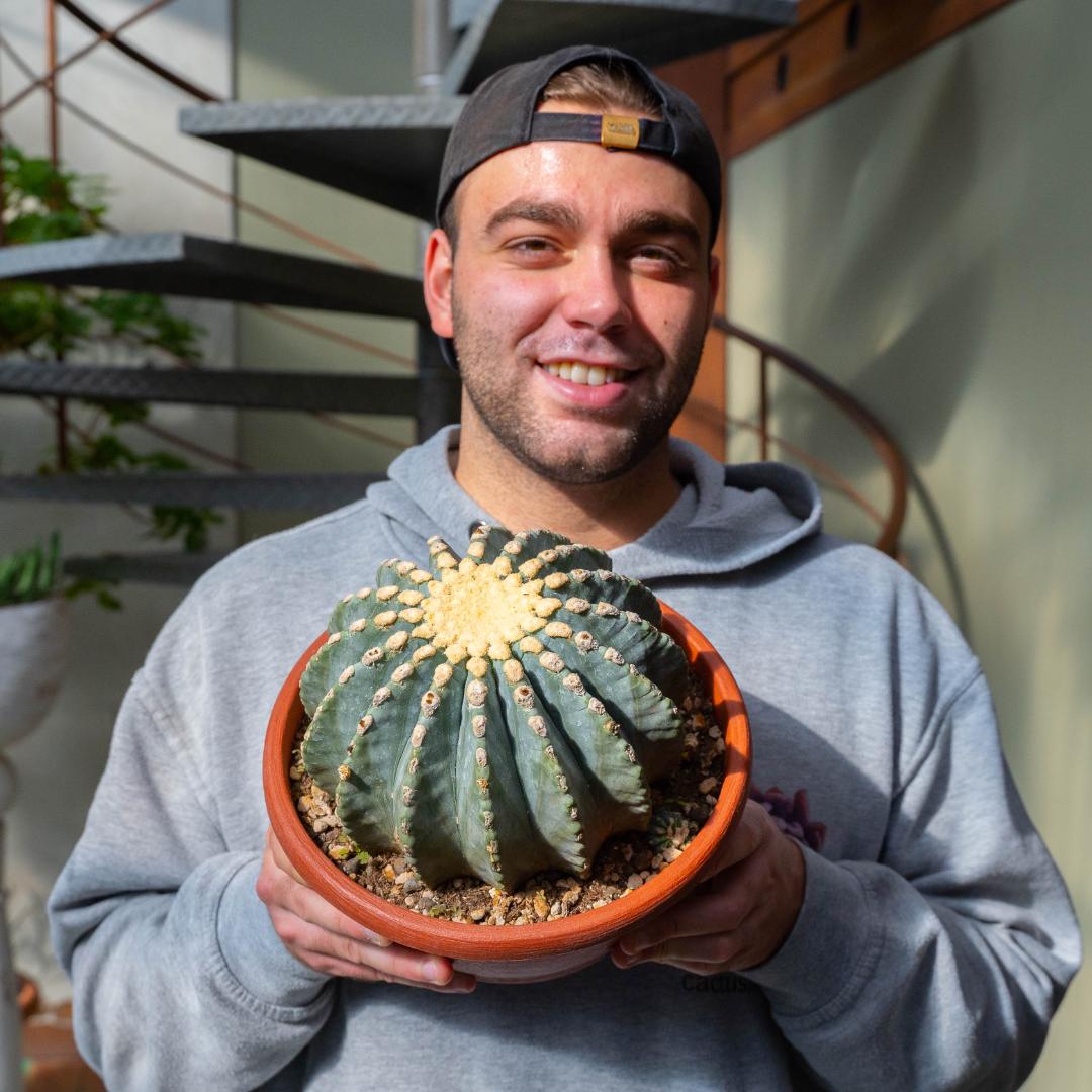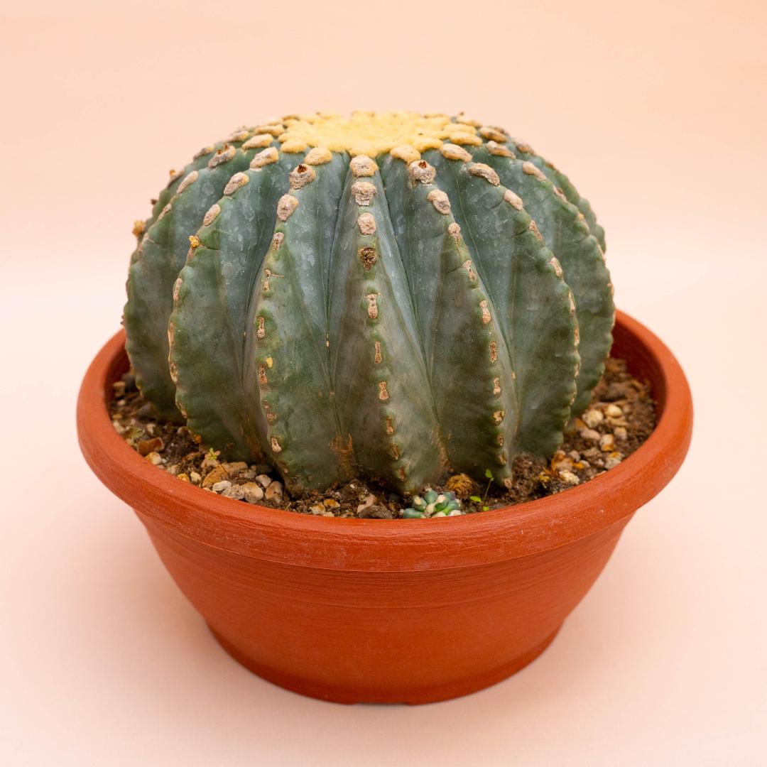 Belonging to the family of Cactaceae, this Ferocactus glaucescens nudum comes in a Ø 25 cm pot with a label indicating its botanical name. This Ferocactus glaucescens nudum is part of Cactusmania’s hybrid collection, has been cultivated for a long time, and has been selected for its hypnotic uniqueness.