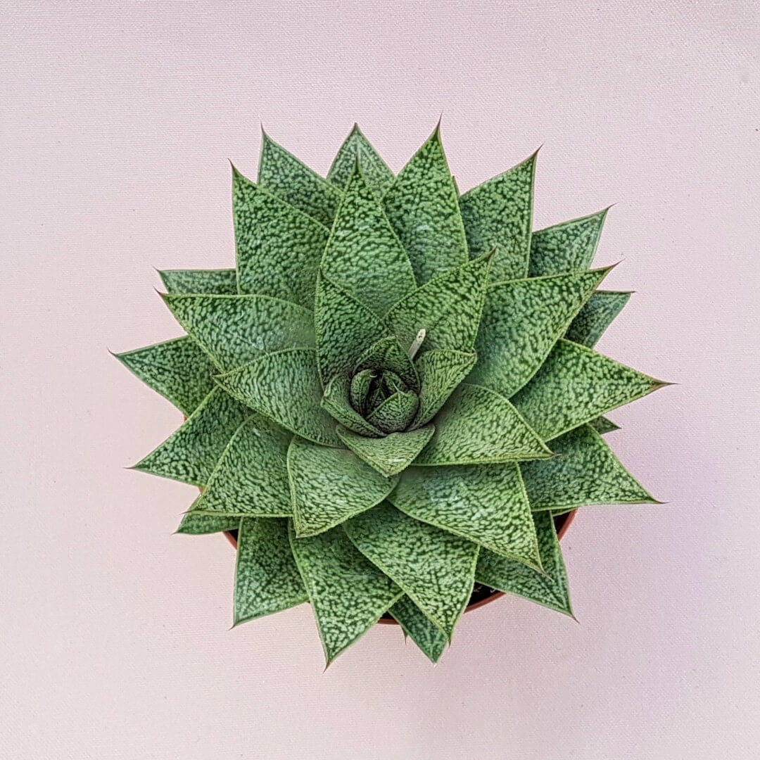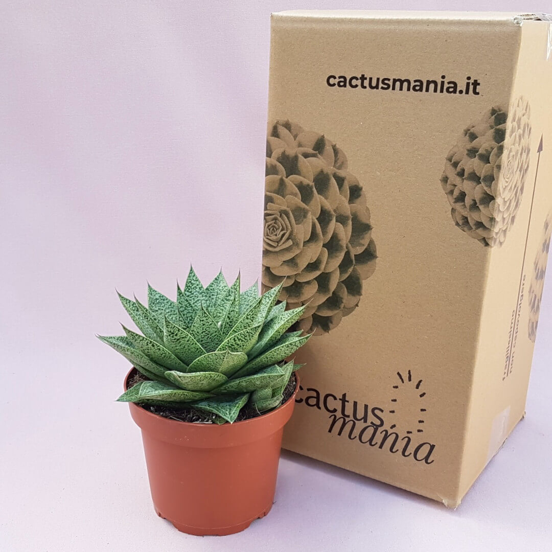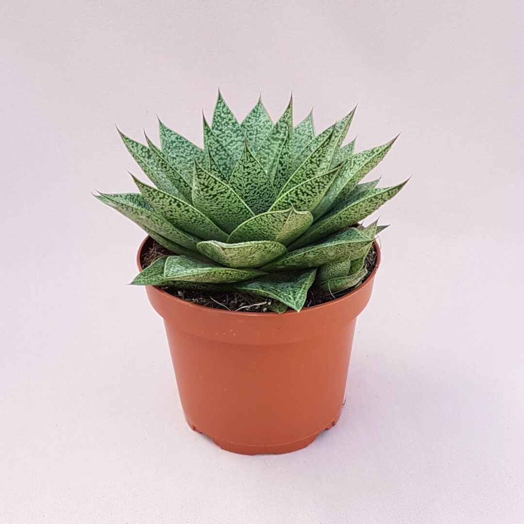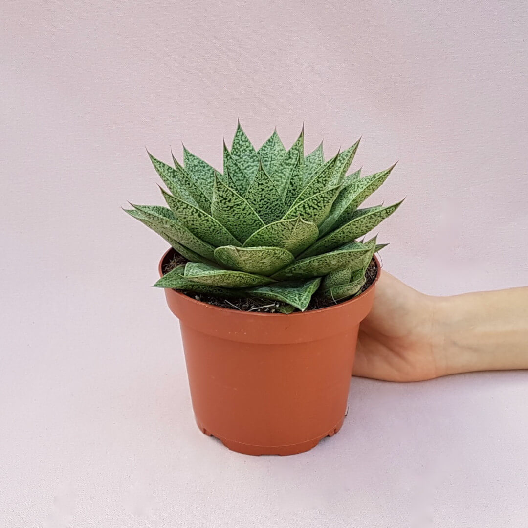 Belonging to the family of Asphodelaceae, this Gasteria D Tiga plant is supplied in a Ø 13 cm pot with a label indicating its botanical name.