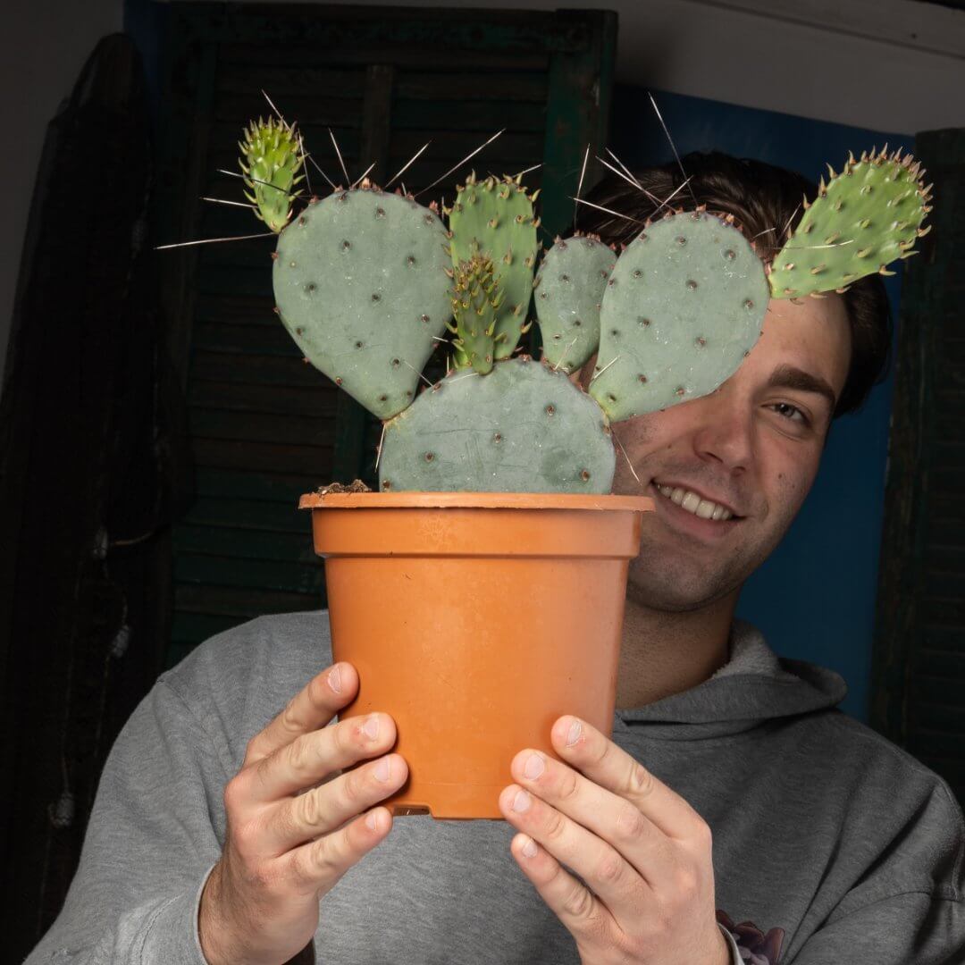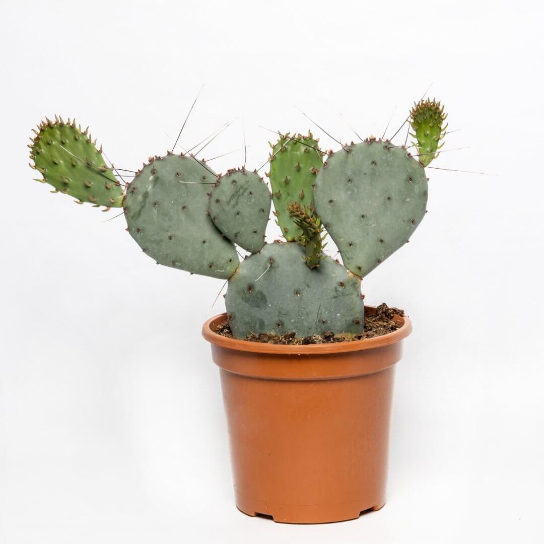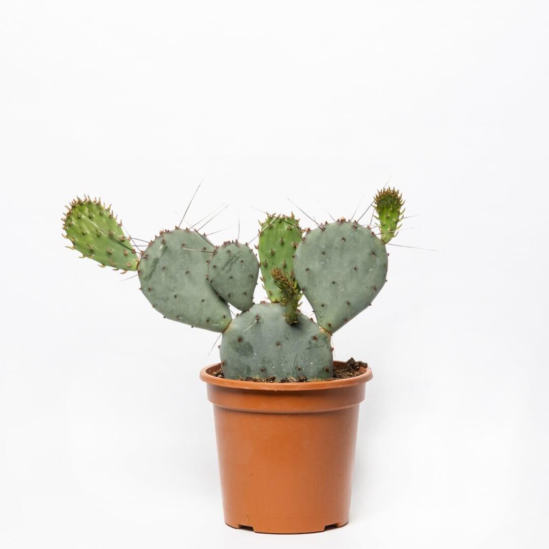 Belonging to the family of Cactaceae, this Opuntia Santa Rita plant is supplied in a Ø 17 cm pot with a label indicating its botanical name.