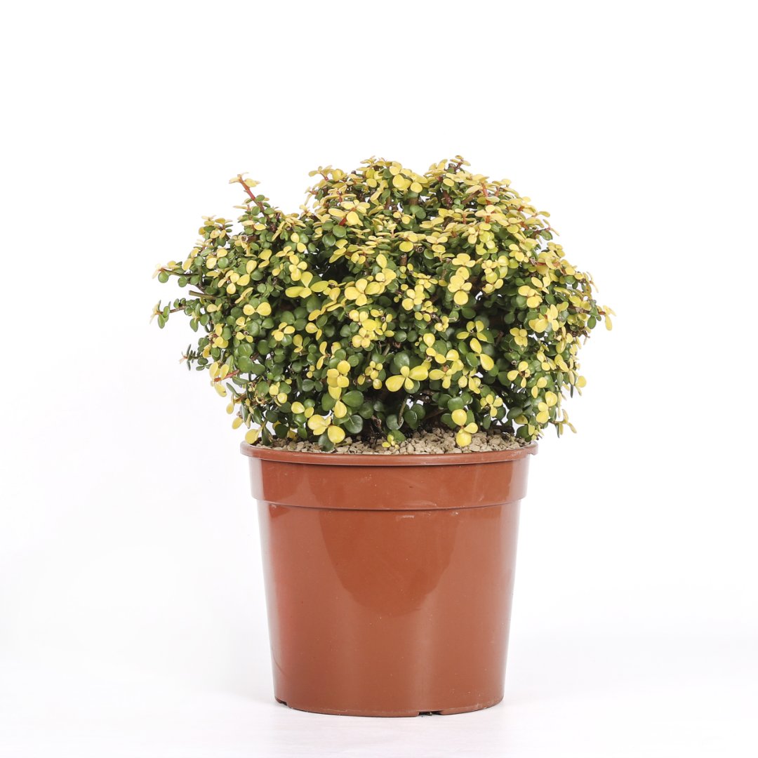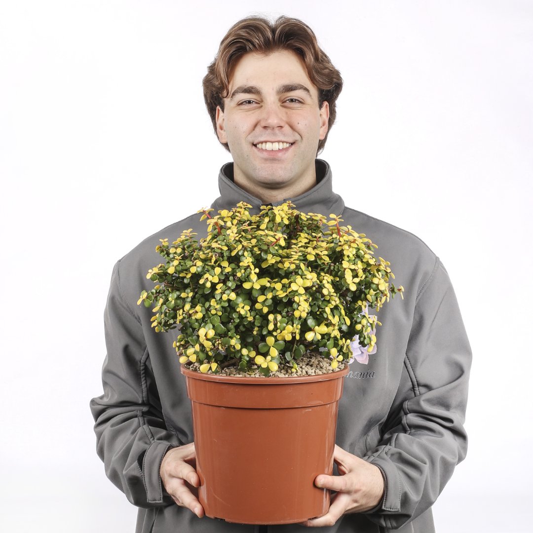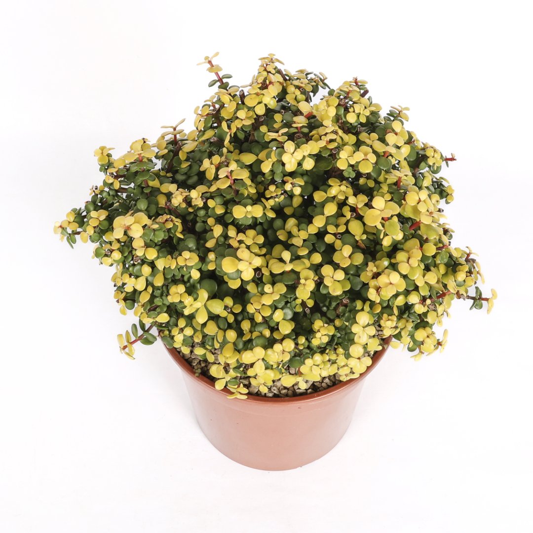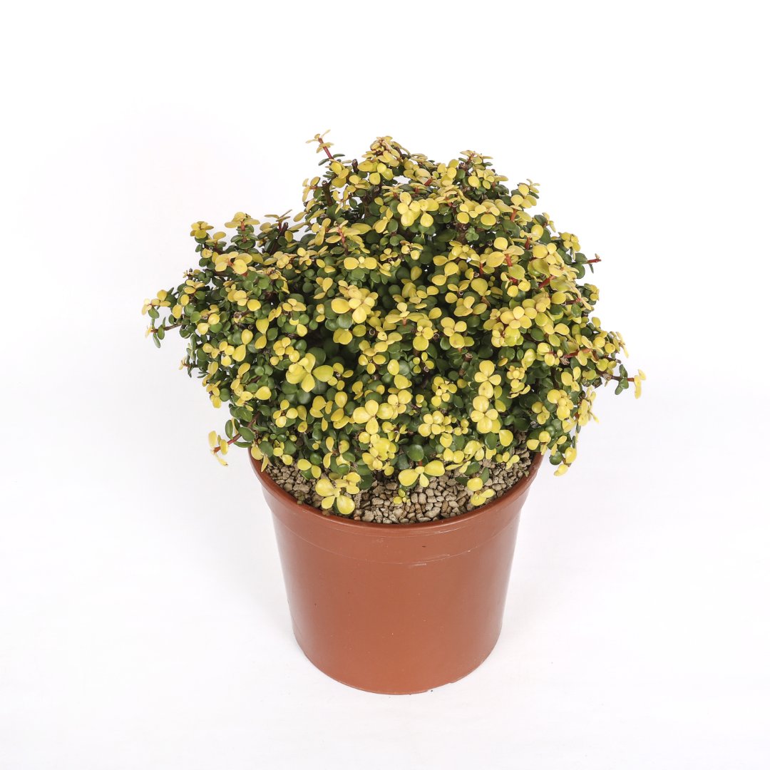 The Portulacaria afra ‘Lemon’ is distinguished by its decorative foliage, which delicately shades from light green to a bright lemon yellow. This coloring becomes particularly intense on new growth and when the plant is exposed to abundant light. Easy to grow, it requires little maintenance: it prefers very bright locations and fears waterlogging. It is the ideal choice for collectors and enthusiasts of rare and sought-after succulents.